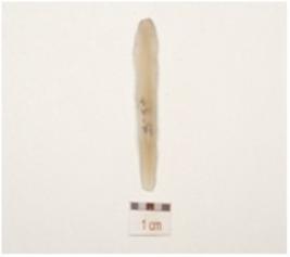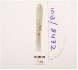 | Description / विवरण | A blade made of chalcedony, prominent bulb on ventral ridge on the dorsal side. retouches on cutting edges. |
