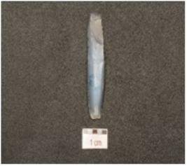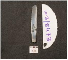 | Description / विवरण | A blade made of chalcedony, prominent bulb on ventral ridge on the dorsal and retouches on cutting edges. |