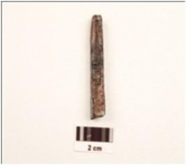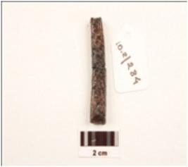 | Description / विवरण | An iron nail, long in shape, uneven surface, rusted and head is missing. |