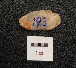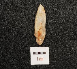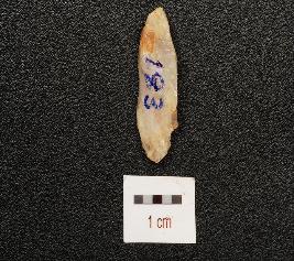 | Description / विवरण | A quartz blade with mid ridge, triangular section and use wear marks on working edge. |