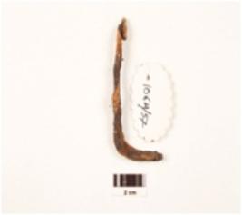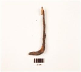 | Description / विवरण | Iron nail with broken head, curved surface with pointed working end, square in section. |
