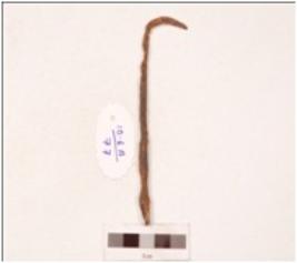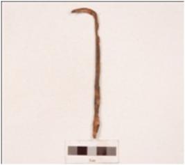 | Description / विवरण | A nail with a round section, damaged flat round head, tapering to a pointed end, rough surface, slightly curved. |