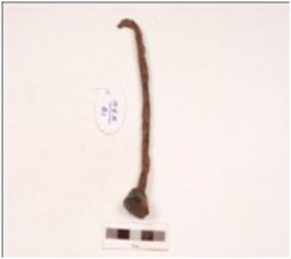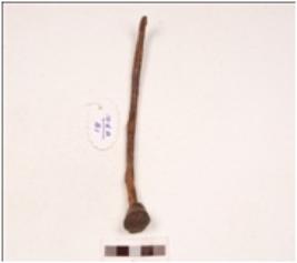 | Description / विवरण | A knobbed nail with rectangular section, tapering to a pointed end, slightly curved, with flat round head, rough surface. |
