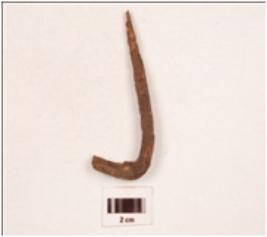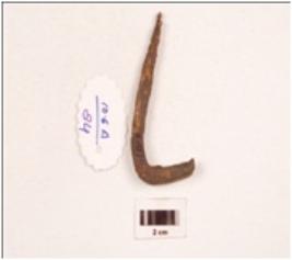 | Description / विवरण | A hook made on iron curved at one end, pointed on other end, rectangular cross, rusted surface. |