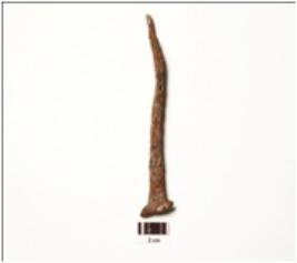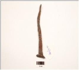 | Description / विवरण | An iron nail, long in shape, uneven in surface, rusted and both head and tail intact. |
