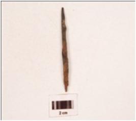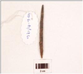| Description / विवरण | Fragment of a iron nail, pointed one end, broken other end, square in section, rusted surface chemically treated. |