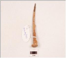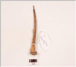 | Description / विवरण | A nail made of iron, one end pointed, other end broad and rounded, square in section, rusted surface. |