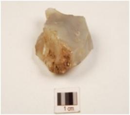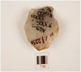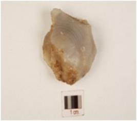 | Description / विवरण | A utilized flake with flake scar, cortex on dorsal, prepared platform, bulb on ventral and use wear marks on working edge. |