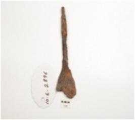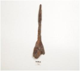 | Description / विवरण | Fragment of iron spear head, pointed handle along one end, broad and blunt working edge on the other end with flat surface. |