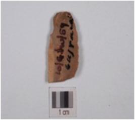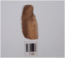 | Description / विवरण | A fragment of a blade made of chert has two ridges on dorsal surface, trapezoidal cross section and wear marks along cutting edges. |