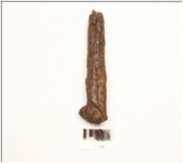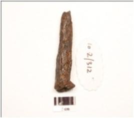 | Description / विवरण | An iron nail, circular cross section, broad head, uneven surface, broken pointed end, multiple cracks on surface. |
