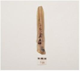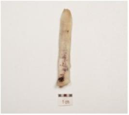| Description / विवरण | Parallel sided blade with double ridge on dorsal side, trapezoidal cross section, prominent bulb on ventral distal end broken and use wear marks along the cutting edge. |