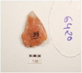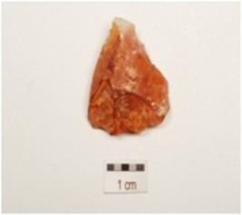 | Description / विवरण | Flake made on chalcedony, prominent bulb on ventral side, flake scars on surface, prepared platform. |