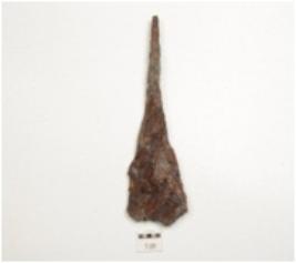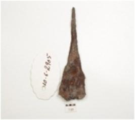 | Description / विवरण | Fragment of an iron spear head, pointed handle along one end and broken along the blunt working edge. |