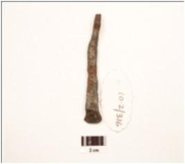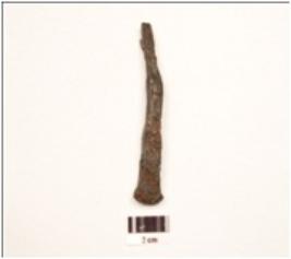 | Description / विवरण | An iron nail, square cross section, broad head, broken pointed end, uneven surface, slightly curved. |