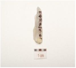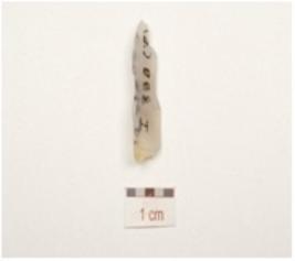 | Description / विवरण | A blade made of chalcedony with single ridge on dorsal side, use wear marks along the cutting edge, prominent bulb on ventral and distal end is broken. |