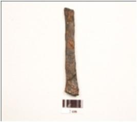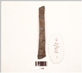 | Description / विवरण | An iron nail, rectangular section, broad head, broken pointed end, uneven surface, chemically treated. |