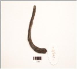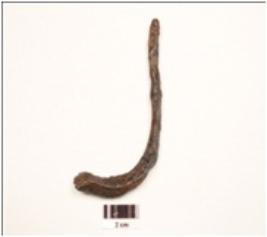 | Description / विवरण | An iron nail, intact upper end, broken pointed end, square cross section, broad head, curved, uneven surface. |