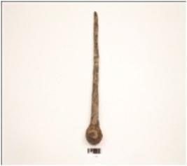 | Description / विवरण | A long iron nail, intact ends, broad and bulb shaped head, square cross section, uneven surface. |