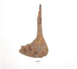| Description / विवरण | An iron sickle, handle along one end and bent along the working edge on the other end. |