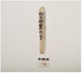 | Description / विवरण | Parallel sided blade with single ridge on dorsal use wear marks along the cutting edge, prominent bulb on ventral side, distal end broken and triangular cross section. |