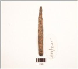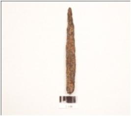 | Description / विवरण | An iron nail, rectangular cross section, intact pointed end, uneven and partly chipped off surface. |