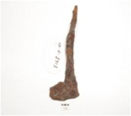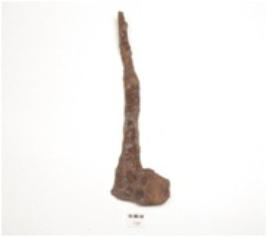| Description / विवरण | Fragment of iron spear head, handle on one end and broken along the broad working end. |