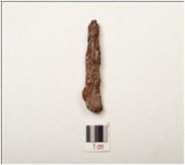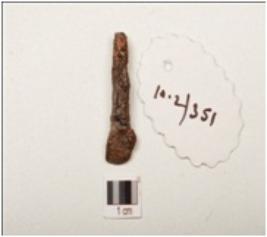 | Description / विवरण | Fragment of iron nail, rectangular in shape, flat and broad at one end, square in section, rusted and chemically treated. |