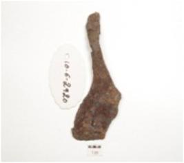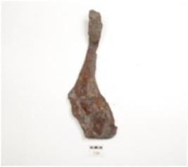 | Description / विवरण | Fragment of iron spear head, slightly bent handle and broad along other end. |