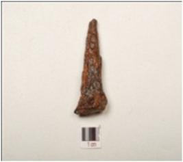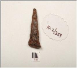 | Description / विवरण | Fragment of iron nail, broad and thick from one end and broken from other end, square in section, deep cracks on uneven surface, rusted and chemically treated. |
