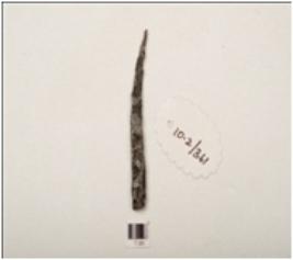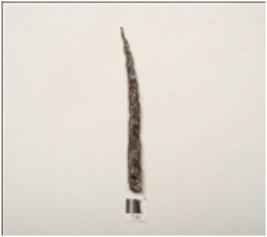 | Description / विवरण | Fragment of iron nail, rectangular in shape with pointed end and slightly curved, broken from top portion, square in section and chemically treated. |