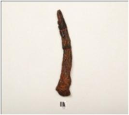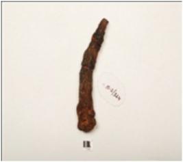 | Description / विवरण | Iron nail, long in size, slightly curved, broad and thick at one end, slightly broken pointed end, rusted, broken and mended rectangular in section. |