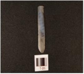| Description / विवरण | A blade made of chalcedony, diffused bulb on the ventral ridge on the dorsal prepared platform on the proximal end and partly retouching on the cutting edges. |
