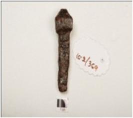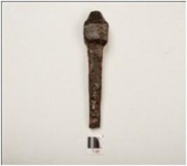 | Description / विवरण | A nail with a cubical head, rectangular cross section made of iron rusted surface and chemically treated. |