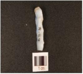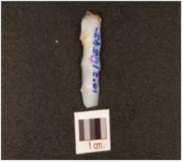 | Description / विवरण | A chalcedony blade, diffused bulb on the ventral side, creusted ridge and cortex on the dorsal and partly retouching on one cutting edges. |