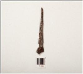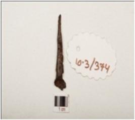 | Description / विवरण | A nail made of iron one end is sharp pointed and other end is thick and broad, rectangular in cross section rusted surface and chemically treated. |