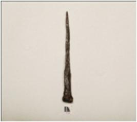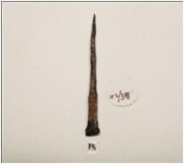 | Description / विवरण | A nail made of iron, pointed one end broad other end rectangular in section rusted surface, chemically treated. |