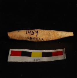 | Description / विवरण | Bone point long narrow having points at both ends. Slightly broken tip both ends, circular in section, well polished and cream in colour. |