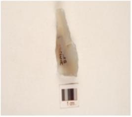 | Description / विवरण | A core made of chalcedony, has three blade scars and surface is smooth. |