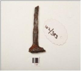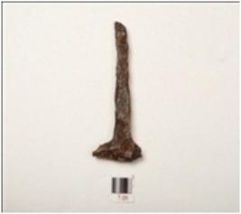 | Description / विवरण | A nail made of iron, pointed end and other end is broad rectangular in cross section, rusted surface chemically treated. |