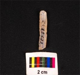 | Description / विवरण | Parallel sided blade with a ridge on dorsal surface, intact proximal end with diffused bulb on ventral surface broken along distal end, use-wear marks along the cutting edge. |