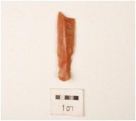 | Description / विवरण | Broken blade with striking platform on proximal end, diffused bulb on ventral side, middle ridge on dorsal surface, distal end broken, triangular cross section. |