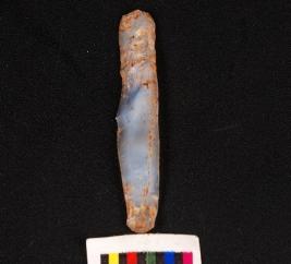 | Description / विवरण | Parallel sided blade made on chalcedony stone, two ridge on dorsal surface, ventral surface rough and diffuse bulb at end, use wear marks on edge. |