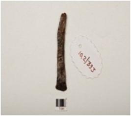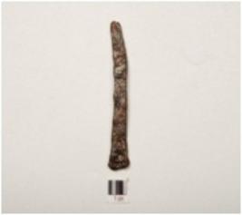 | Description / विवरण | A nail made of iron elongated body flat broad one end, broken other end, chemically treated surface, rectangular in section. |