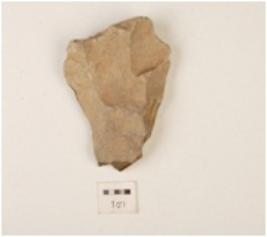 | Description / विवरण | Flake with one striking platform made on chert, prominent bulb on ventral side, flake scars on surface, rough surface. |
