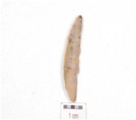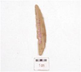 | Description / विवरण | A burin made on chert, double ridge on dorsal side, diffused bulb on ventral side and use wear marks on edges. |