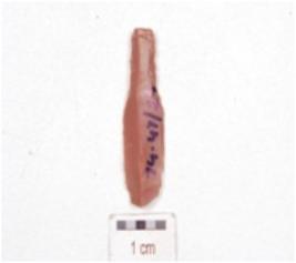 | Description / विवरण | A blade made on chert, mid ridge on dorsal side, diffused bulb on ventral side and use wear marks on edges. |