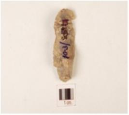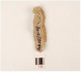 | Description / विवरण | A chalcedony blade with triangular cross section, uneven surface and cortex visible. |
