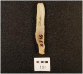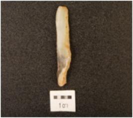 | Description / विवरण | Blade on chalcedony, parallel sided, striking platform on proximal end with prominent bulb on ventral side, flake scars on dorsal side, triangular cross section. |