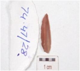 | Description / विवरण | A blade mid ridge on dorsal side, diffused bulb on ventral side and use wear marks on edges. |